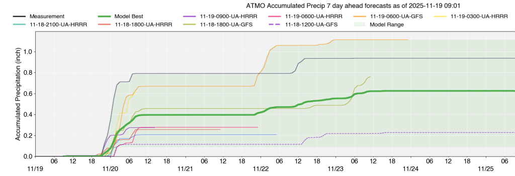 Here’s the UA WRF ensemble plume forecast for Tucson; the ensemble mean predicts 0.4” through tomorrow afternoon.