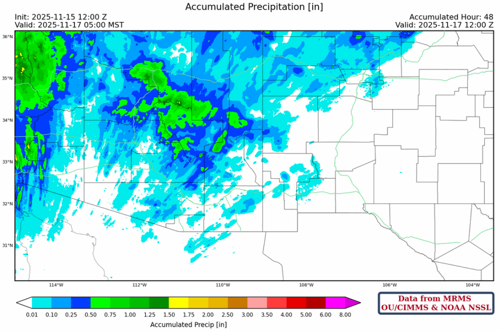 Hopefully, you all got some rain last weekend. It was light in Tucson and, as in the folklore, it missed both the Phoenix and Tucson airports with only a trace recorded at each location. The 48-hour accumulated MRMS observations (Sat-Sun) below show the White Mountains and the peaks in Gila and Coconino counties fared a little better with rainfall accumulation between 0.5 and 1.5”. Humphreys Peak (11,500ft) is reporting 9” of snow depth already, and Sunrise Peak (10,700ft) got a dusting.