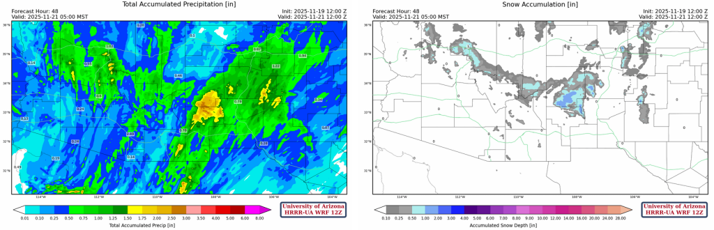 Accumulation of 0.25” to 0.5” are predicted for Tucson across the four morning UA WRF forecasts. Snow accumulation is restricted to the higher elevations on the Mogollon Rim and into western New Mexico, shown on the right.