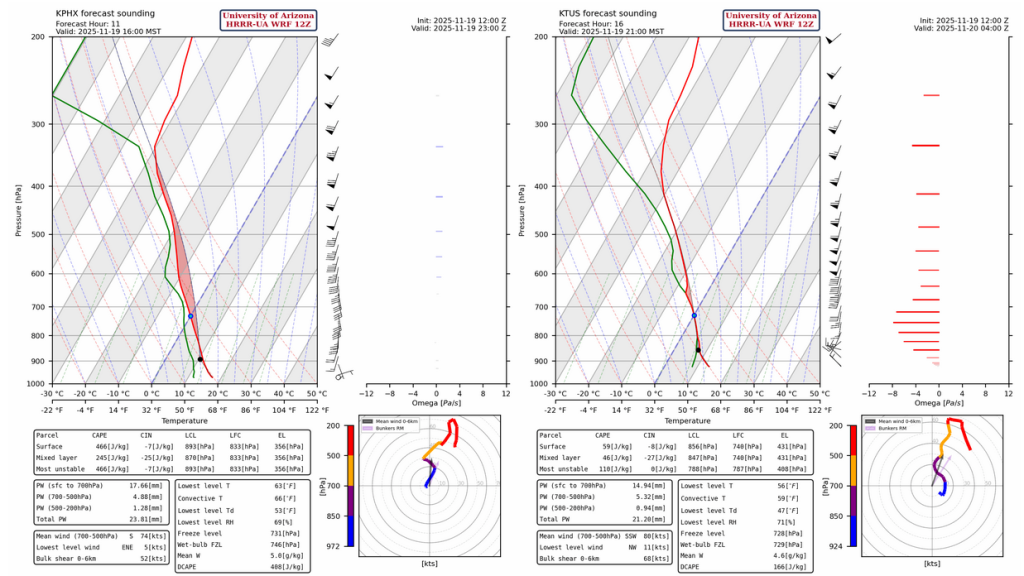 The forecast skew-Ts for Phoenix at 4pm (left) and Tucson at 9pm (right) show better chances for thunderstorm development in Phoenix with over 450 [J/kg] of Convective Available Potential Energy (CAPE). Though vertical motion is still forecast for Tucson skew-T, as shown by the negative Omega values on the top right red bars, as a result of the synoptic lift described earlier.