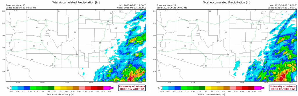 The axis of the monsoon moisture is shifting further west, bringing additional thunderstorms to eastern Arizona. New Mexico will continue to receive lots of precipitation over the next few days. The upper-level low along the TUTT in the Gulf of Mexico will continue to travel westward, eventually weakening in Mexico. This may aid convection in central Mexico and push moisture northward and aid in the monsoon circulation. While storms begin to form in southeast Arizona, New Mexico will accumulate quite a bit of rainfall over these next three days looking at the accumulated precipitation totals through to midnight on Tuesday evening.