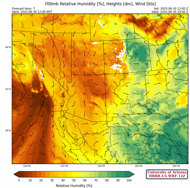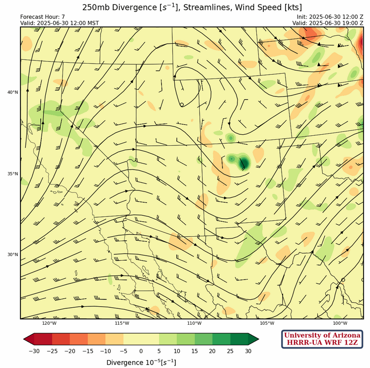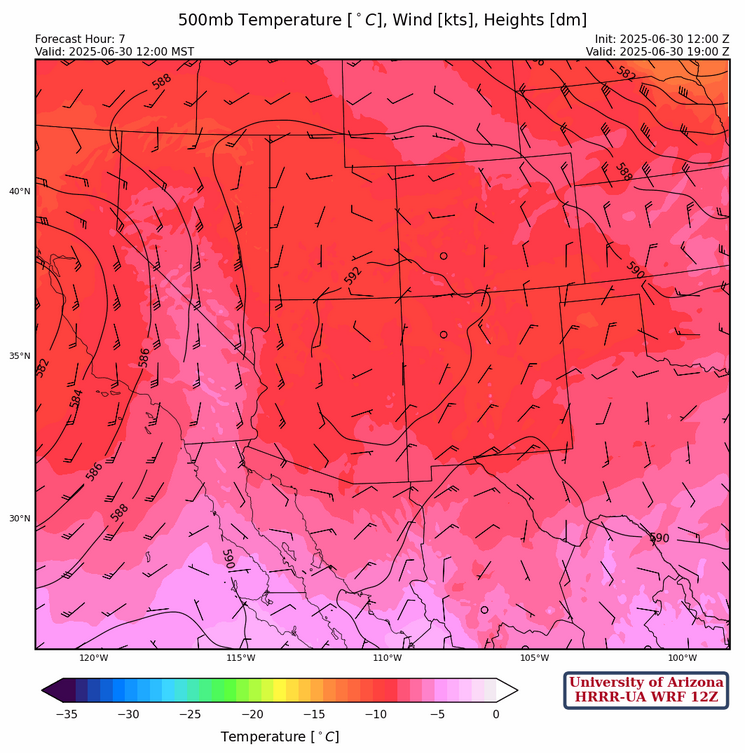The strongest thunderstorms yesterday were along a line from northeast New Mexico southwest to far southeast Arizona. The storm motion was to the southwest in New Mexico with microburst winds near 45 mph. Storms tried to develop along the Mogollon rim and the White mountains, but vertical development was limited and only virga or a few drops fell to the ground. Temperatures continued to warm at the surface, reaching 110°F in the Arizona deserts.
