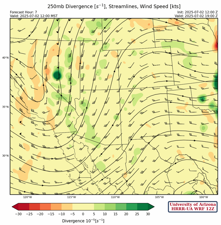 At 250mb, the trough off the coast of California has advanced further onshore. Strong southerly winds associated with this trough have made their way into Arizona and New Mexico is experiencing strong westerlies.