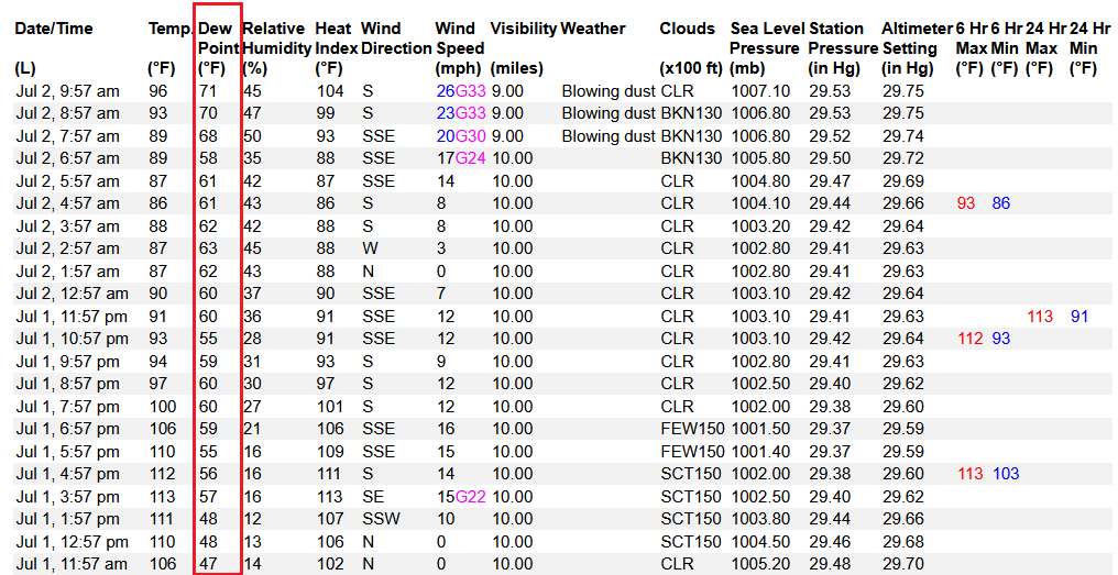Today brings flooding risks to Arizona. Southerly winds, the dynamic lifting ahead of the upper-level trough in California, and moisture from the gulf surge in combination bring thunderstorms to the mountains in the western half of the state. Here’s the most recent observations from Yuma showing evidence of the gulf surge; the dewpoint temperautres increase from high 40s at noon yeserday to the low 70s this morning.