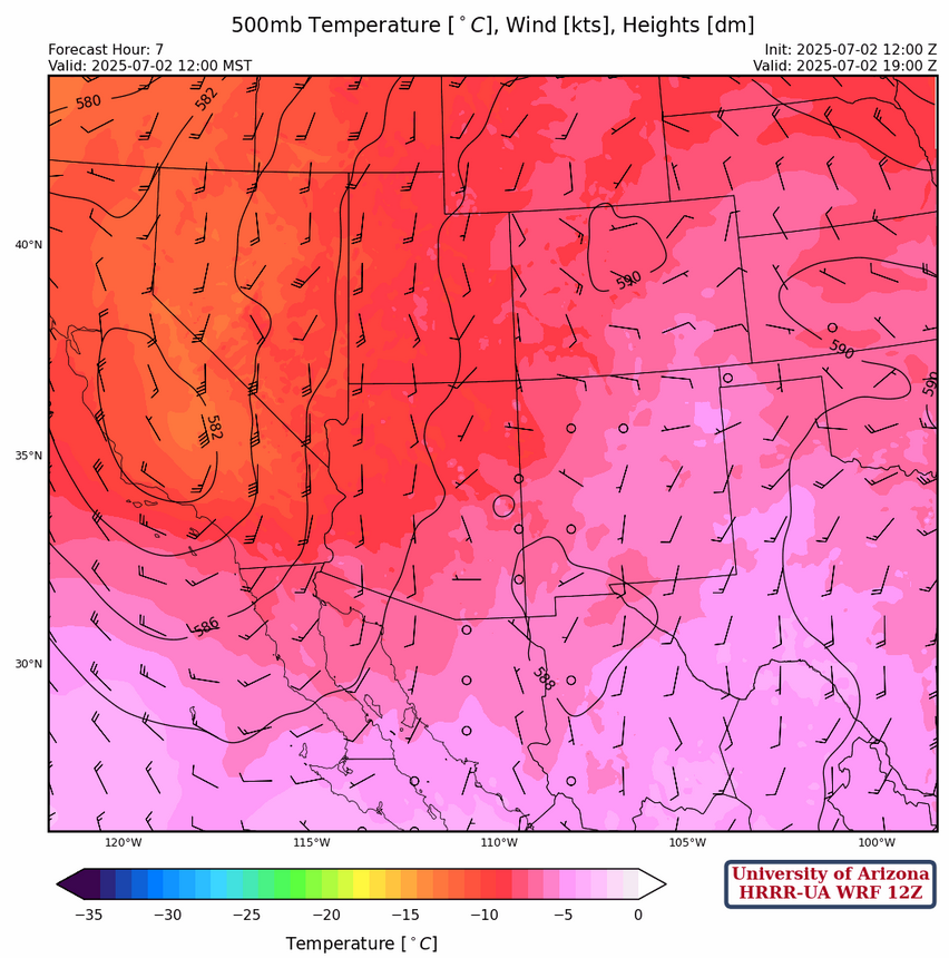 At 500mb, the cutoff low has advanced slightly further into California. Light and variable winds are over Arizona and southerly winds are over New Mexico. Temperatures in Arizona have not changed and are still cooler than normal.