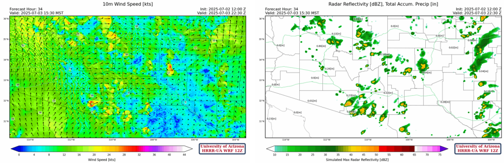 Some of these storms may travel off of the mountains and into the valleys. The dynamic lifting from the upper-level trough could cause storms to train over the mountains along the Mogollon Rim, where new storms form upstream of previous ones, causing many storms to potentially hit the same location over and over. Mircrobursts are also expected with many of the storms, with strong winds traveling towards Phoenix potentially casuing blowing dust if it arrives before the rain. Southeastern New Mexico is also expected to receive rain today starting in the afternoon and into the evening, mostly staying over the mountains. Some storms could move into the valleys and produce flooding. Similarly to yesterday, we’re favoring the HRRR-UA WRF from 12Z forecast below on the left, as it seems to handle the movement of thunderstorms off the terrain and to the west better. Rainfall will likely arrive in the early afternoon for Tucson and mid to late afternoon in Phoneix.