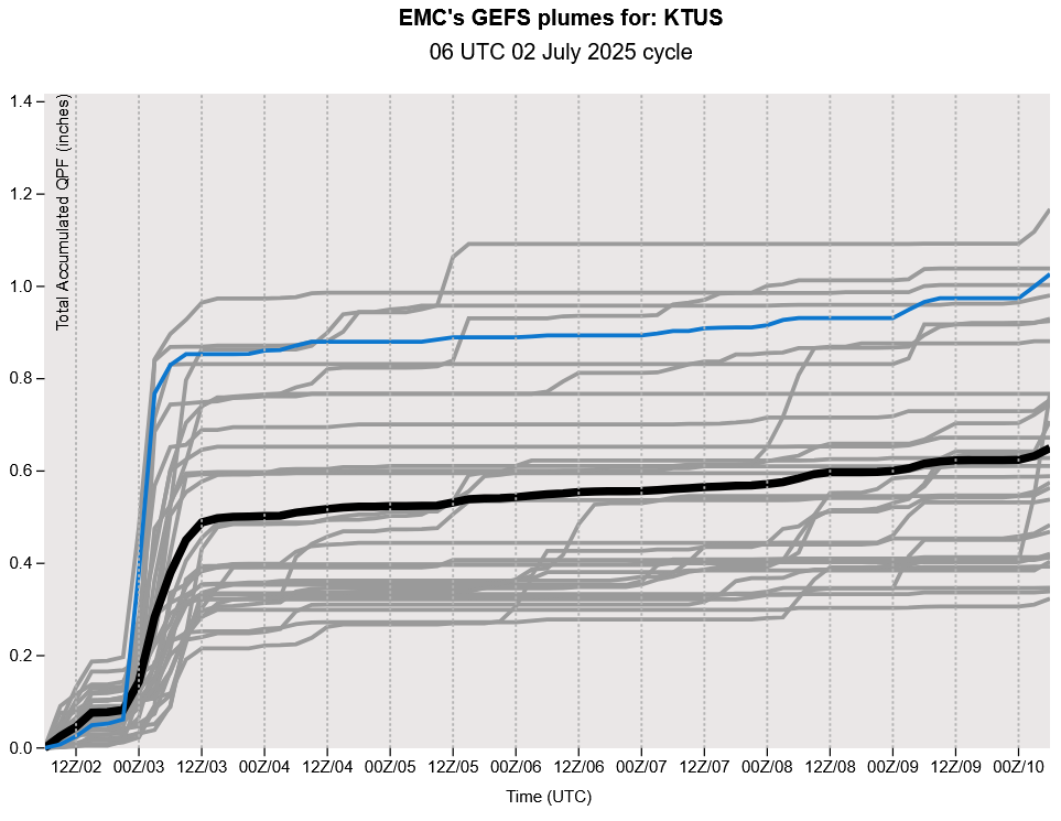 As the trough swings by to the north, mid- and upper-level temperatures will warm. At 500mb today it’s –8C then warms to –5C by Friday. Model forecasts also show 700mb drying at the same time. There should be enough low-level moisture for thunderstorms over the mountains, but few will make it into the valleys. The GEFS plumes for Tucson and Albuquerque in the images below indicate the dry trend will continue through the early part of next week.