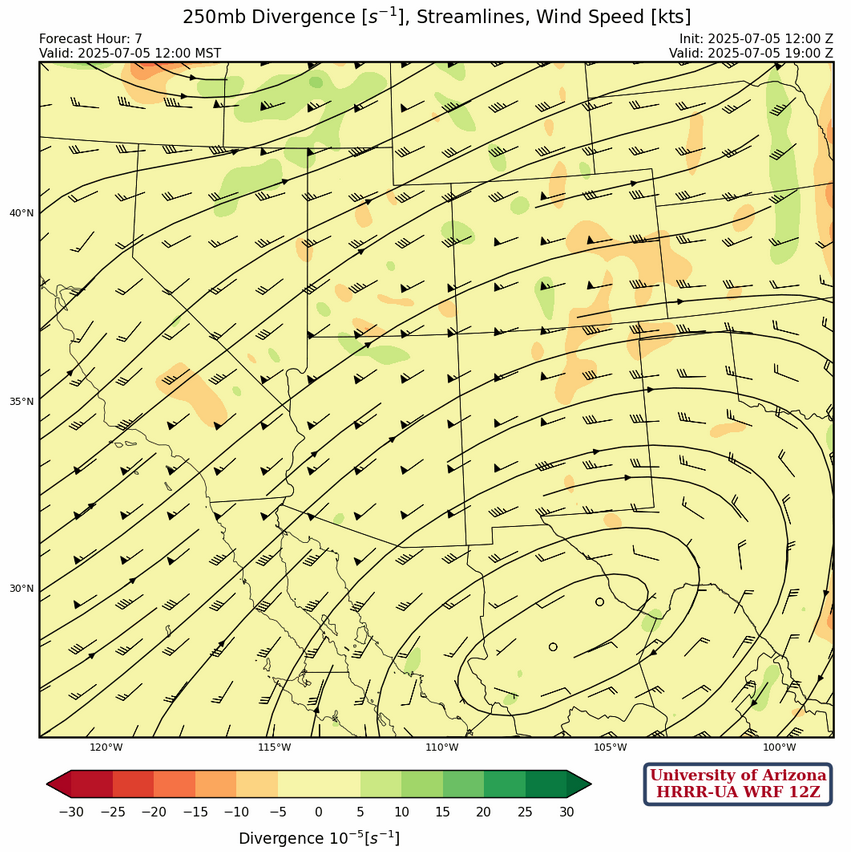 More widespread thunderstorms are expected over the mountains of eastern Pima, Santa Cruz, Cochise, and Graham counties. Some anvils and storms may move off the mountains, leading to some rain in the valleys. Thunderstorms are forecast over the mountains across all of New Mexico, with some storms moving into the valleys. Throughout both states, microbursts associated with stronger storms are expected given the wind speed forecast below.
