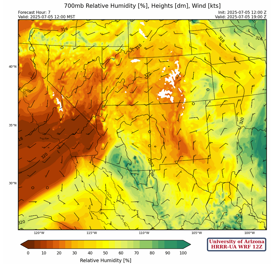 The high-pressure axis is from western Kansas to west Texas then extending west to the international border in Arizona at 700mb. Winds are light southerly with some moisture in eastern New Mexico and southern Arizona. Very dry air is in California.
