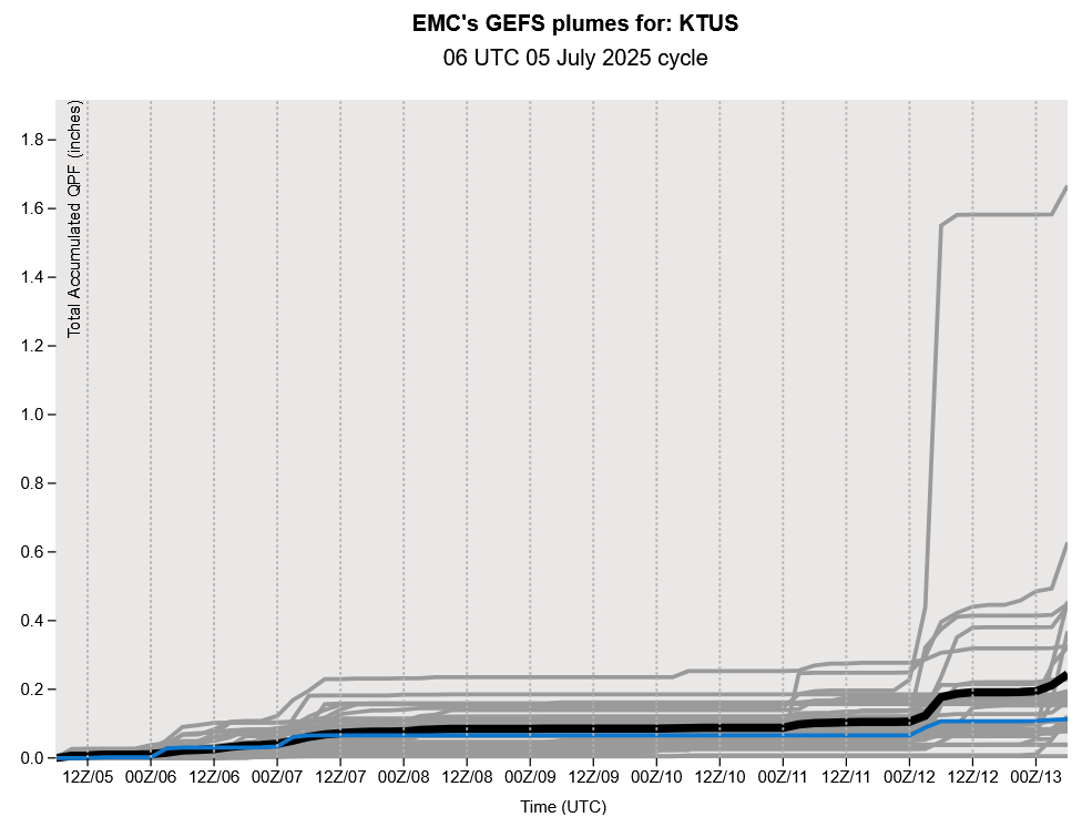 A similar pattern to tomorrow is expected on Monday, with storms over the mountains of southern Arizona and over the White Mountains, and widespread across New Mexico. Drier weather is forecsat early next week in Arizona and temperatures are expected to rise throughout the rest of the weekend and into next week. GEFS plume for Tucson below shows no significant precipitation during the weekdays with an uptick the following weekend.