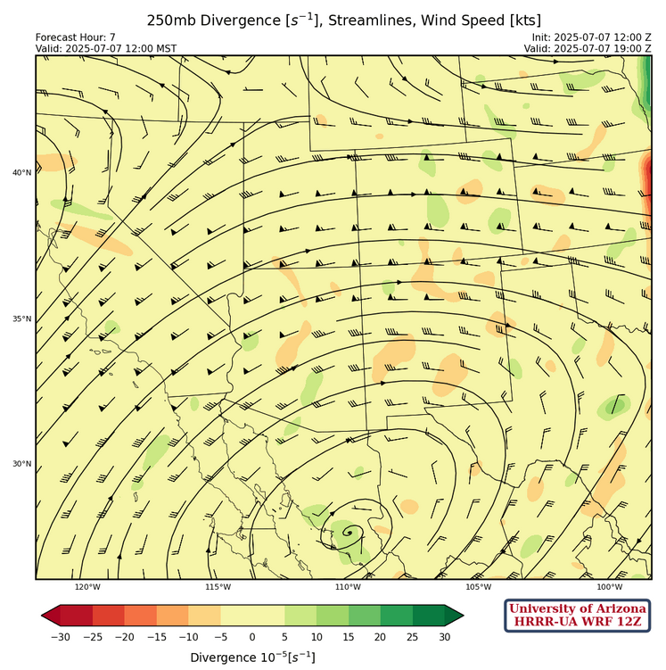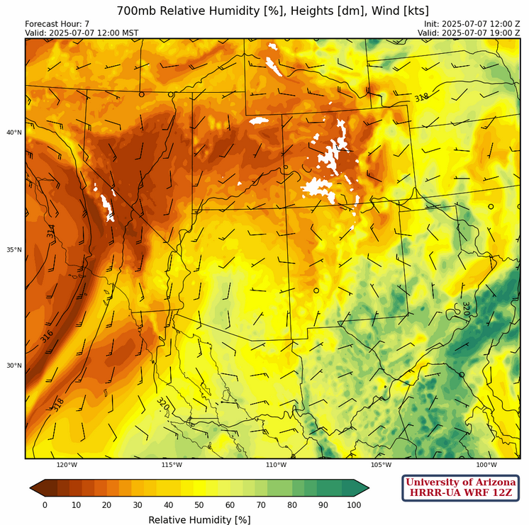 The high pressure at 700mb is located near Tucson with southerly flow to the west and westerly flow across New Mexico. Light and variable winds are across southeast Arizona to southern New Mexico.