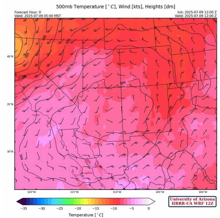 High pressure at 500mb is over eastern Arizona with a low pressure just off the coast of northwest California. Although the high pressure is in a better position than yesterday it is forecast to move west off the California coast, west of San Diego, in a few days as the low pressure moves from California to the midwest.