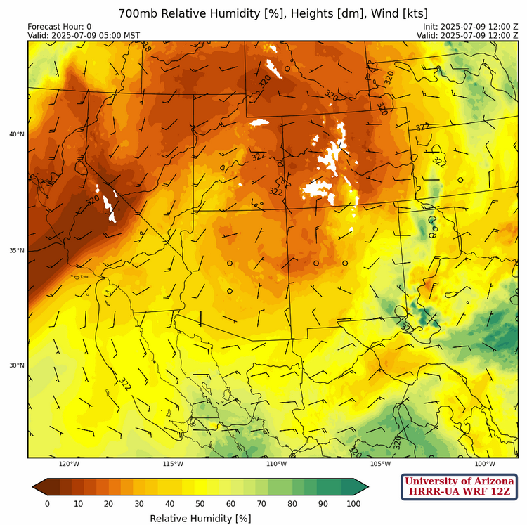 Winds aloft at 700mb are generally less than ten knots as a high-pressure ridge is over both states. Deeper easterly flow associated with the monsoon remains in-place over Mexico.