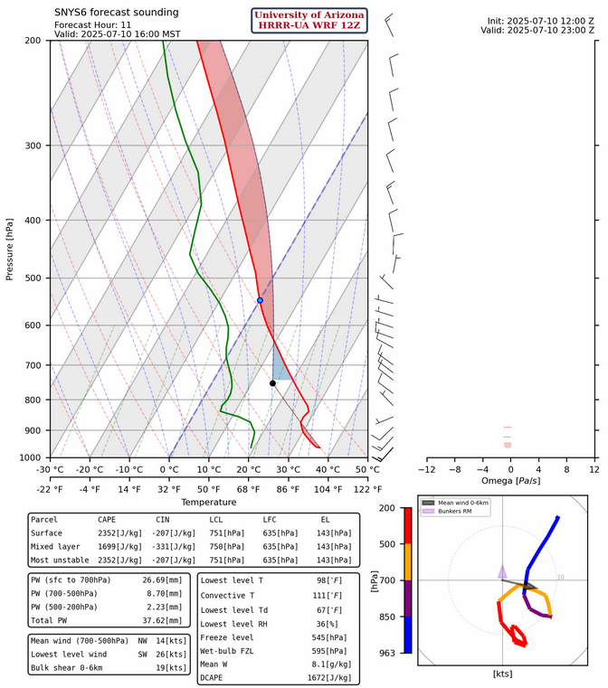 The 4 pm forecast sounding for Lukeville, AZ below shows the dilemma we face with the forecast for today. Thunderstorm outflows from Mexico will produce cooling in the sounding below 800 mb such that the 2300 J/kg convective available potential energy (CAPE) is offset by 246 J/kg of convective inhibition (CIN). It’s possible that there will be enough lift for thunderstorms to form in the mountains of central Pima county this evening.