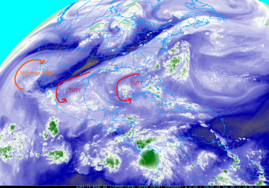 At 250mb, a tropical upper tropospheric trough (TUTT) is still moving southwest across central Mexico. Dry air is pulling around the TUTT from Texas to central Baja California. Another TUTT is over western Cuba and continues to move west.
