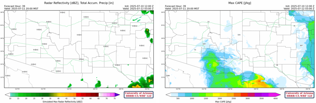 A similar, but weaker, pattern of storms is expected over New Mexico tomorrow. Storms will form over the mountains of northeastern and southwestern New Mexico. Arizona is also expected to experience a similar pattern, but alongside that comes a similar amount of uncertainty. Another push of moisture will arrive around the late afternoon to the evening, which will bring strong CAPE into the region. There is a chance of storms firing off in Pima, Santa Cruz, and Cochise counties, but this will need to be evaluated again tomorrow given the morning forecasts.