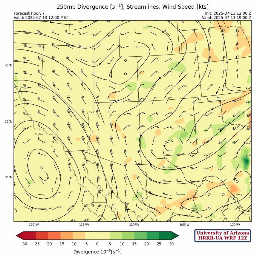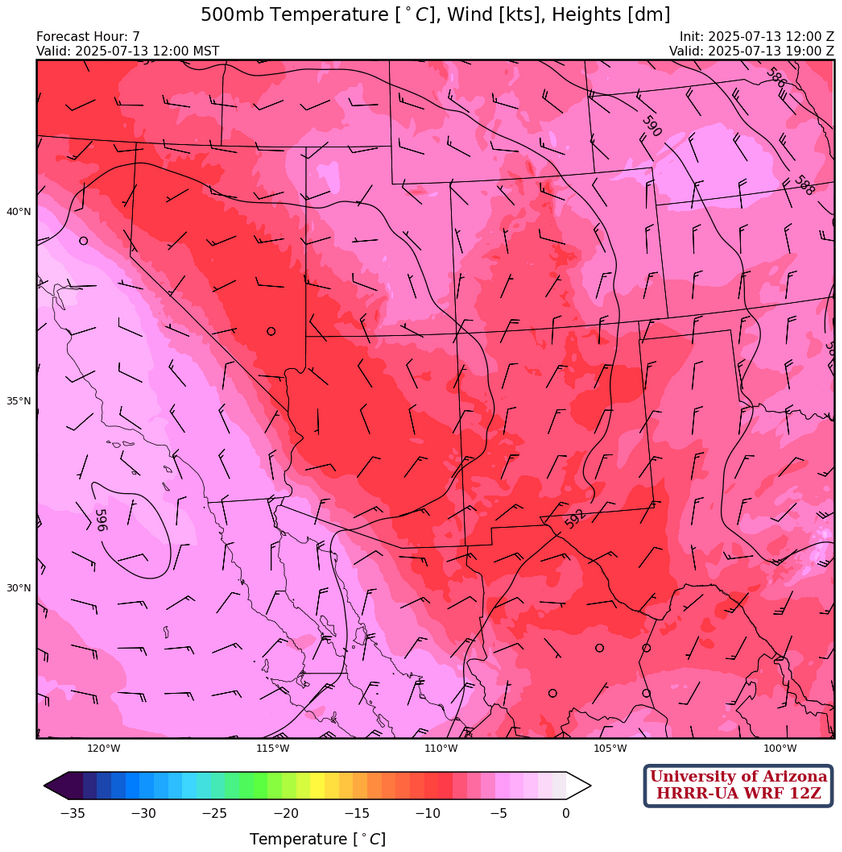 Lower down in the atmosphere at 700mb, winds are less than 10 mph across the region and generally westerly in New Mexico and variable in Arizona. Highest moisture values are in southern Arizona and New Mexico.