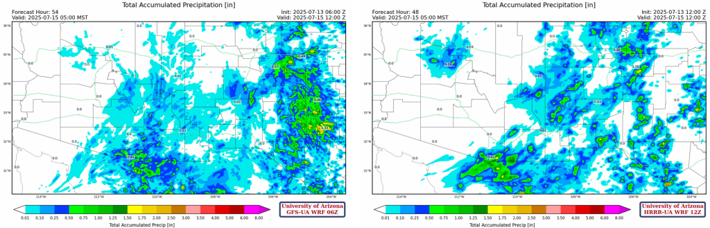 GFS-UA WRF 6Z (below left) has more 48-hour total precipitation accumulation than the HRRR-UA WRF 12Z (below right). The GFS-UA WRF is the preferred solution given it shows some precipitation in the Tucson metro area, which fits better with the change in wind direction seen in the progression of forecast soundings from today to tomorrow.
