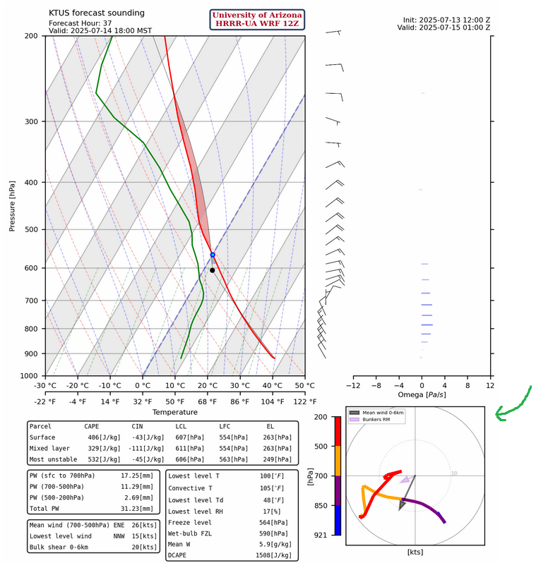 The inverted-v sounding would produce stronger microbursts if there was more moisture. The forecast has positive omega values (Pa/s) nearest the surface showing descending vertical motion (the blue bars on right side of the graphic) and DCAPE values are about 1700 J/kg, meaning dust storms are possible with these dry downdraft winds. Precipitation amounts will be higher in the mountains of Cochise and Santa Cruz counties.