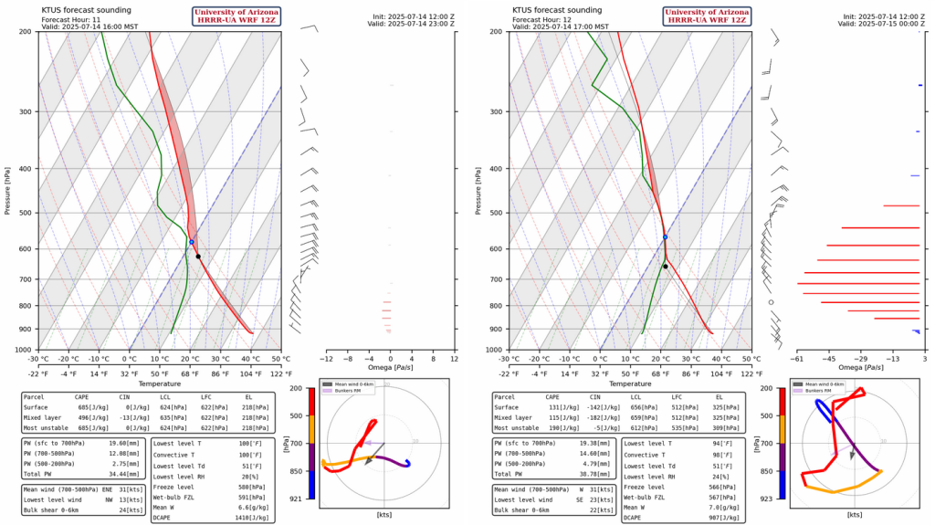The HRRR-UA WRF 12Z forecast for this afternoon in Tucson at 4pm shows about 500 J/kg Convective Available Potential Energy (CAPE) and very little Convective Inhibition (CIN). The hodographs show storm motion is to the southwest. DCAPE values are 1400 J/kg.