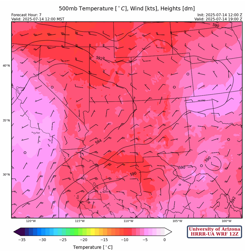 At 700mb, the ridge axis extends across central Arizona to central New Mexico with easterly winds at 5 to 10 mph below the ridge axis becoming 15 to 20 mph in northern Mexico.