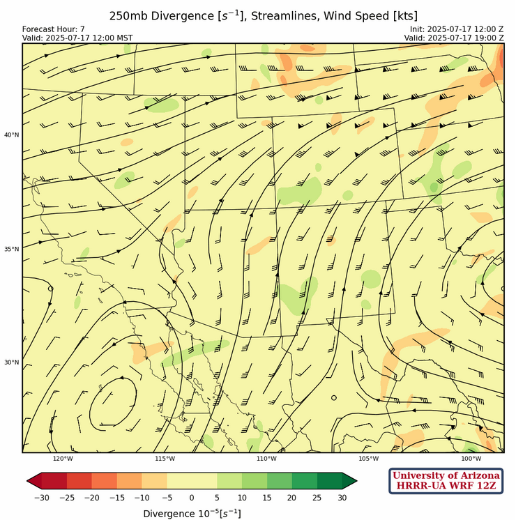At 250mb, the high pressure ridge is centered over eastern Louisiana, and ridge axis extends west to El Paso and east off the Carolina Coast. This puts southern Arizona and New Mexico in southerly flow at 10 to 15 mph increasing to 30 mph along the Arizona/Utah border. A broad area of divergence is associated with the increased winds from northwest Arizona eastward to southern Kansas.