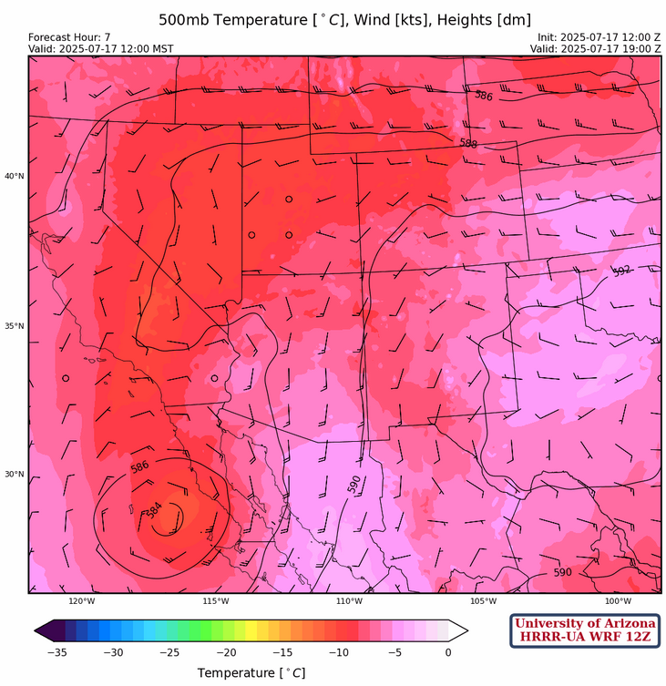 Model forecast are showing a down day across the state as warm air aloft pushes into the state from the south around the upper low off the Baja Peninsula. The MCV in western Arizona does help storms in far northwest Arizona, but otherwise there’s only isolated mountain storms over the rest of Arizona forecast. In New Mexico, an uptick in storms today in the northern and central portion of the state especially in the eastern portion associated with the weak front in that area.