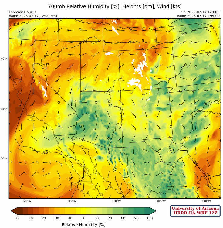 At 700mb, moisture continues to circulate around the low over the Pacific south of San Diego. The best moisture is over northwest Arizona extending eastward into northern New Mexico. Dry air is moving north from western Mexico and is along the international border from Nogales west to Yuma. Higher moisture values from the spine of the Sierra Madre’s is poised to move northward into eastern Arizona.