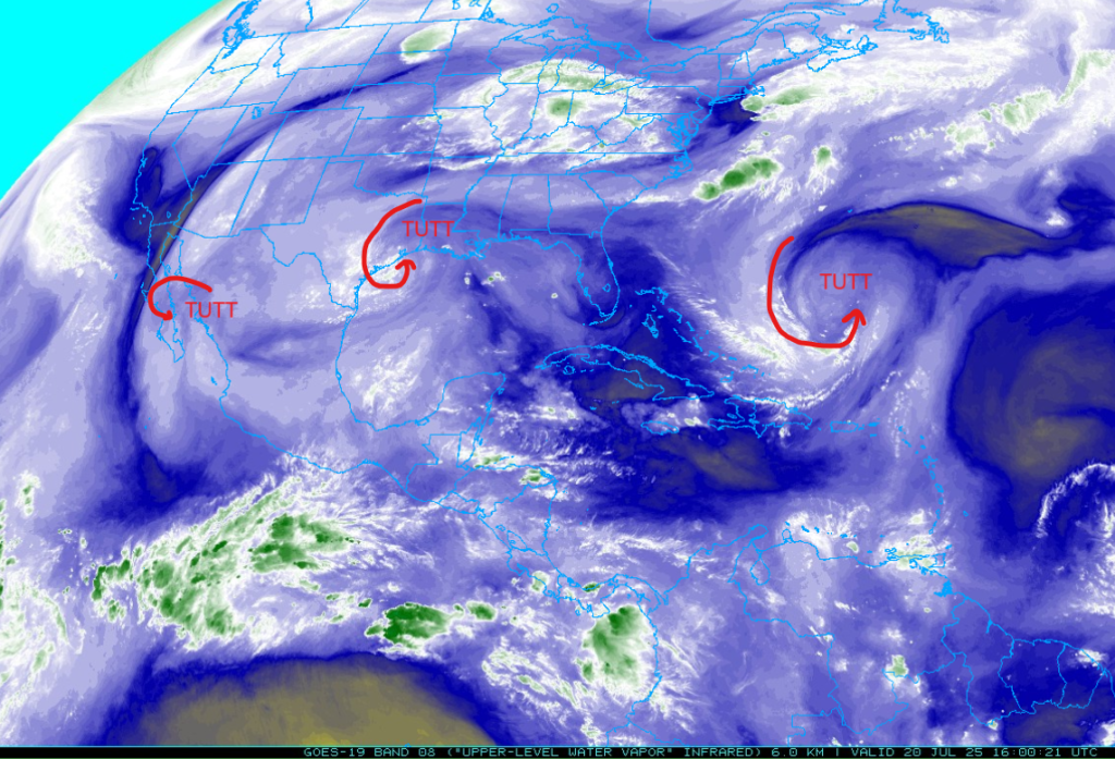 The tropical upper tropospheric trough (TUTT) is moving northwest up the Gulf of California with another TUTT is off the coast of Texas. Another TUTT is in the Atlantic well east of Florida.