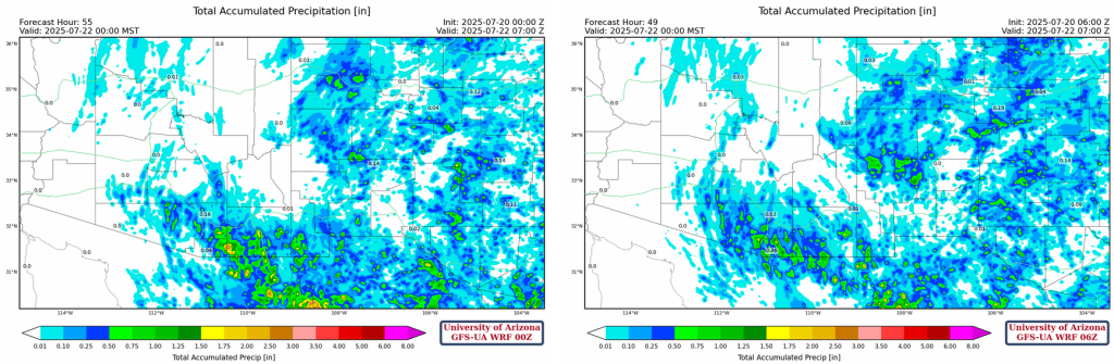 On Tuesday, the focus shifts to northern Arizona with storms forming along the Mogollon Rim into southwest New Mexico, moving northward to Flagstaff and hopefully the Grand Canyon to rain on the fires. We’ll need to see what the situation is like after the stormy day tomorrow.