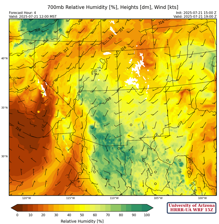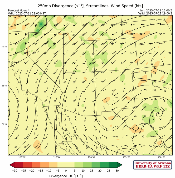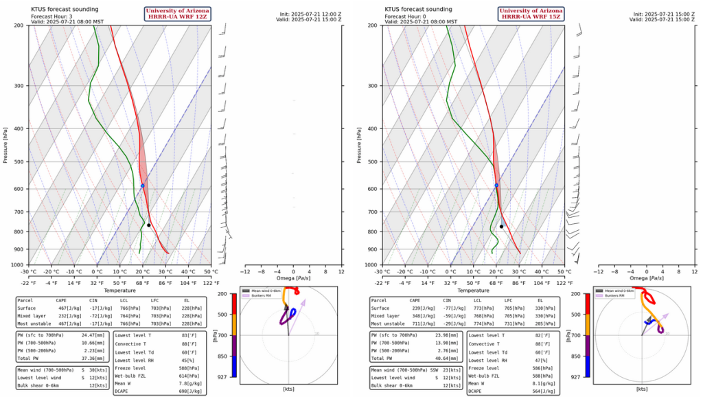 Storms form from Tucson and further north, with the main focus on the Mogollon Rim/White Mountains, and east into New Mexico. The international border has less precipitation and may be a reflection of dry mid-level air moving into the state. Both HRRR-UA WRF 12Z and 15Z model forecasts runs show Gila Bend getting a quarter to half inch of rain tomorrow; HRRR-UA WRF 15Z is the preferred forecast and the one that shows 0.5″. There’s another round of precipitation in HRRR-UA WRF 15Z for Tucson tomorrow, also around 0.5″. However, there’s a strong dependence on what happens today, so we’ll have to see how the forecast changes or not tomorrow morning.