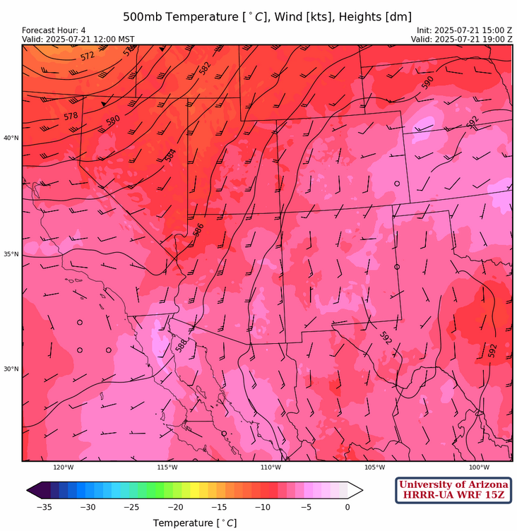 Winds at 500mb are southerly across the state in response to the circulation between the ridge and an upper-level trough centered in Oregon. Temperatures remain relatively cool with –8°C at Phoenix and probably the same across New Mexico, but without the ABQ and ELP soundings we will have to rely on persistence from yesterday.
