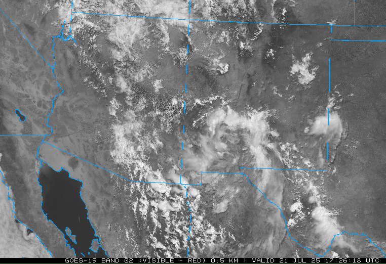 There are lots of variables for today’s forecast, meaning uncertainty is high. The gulf surge that never was has left the low deserts dry for surface-based convection as the mid-level cloud deck will limit surface heating (see satellite image below of current cloud field). The Tucson area and east should have enough heating for stronger convection with higher mid-level moisture available, and some storms will produce heavy rain.