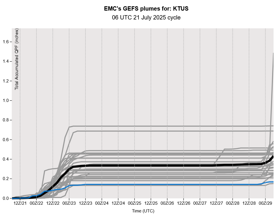 The model runs have been inconsistent in terms of rainfall totals at the Tucson airport with the latest HRRR-UA WRF 15Z model run showing about 0.3″, whereas the HRRR-UA WRF 12Z has 1.1″. As stated above the 15Z has a better initialization, though these slight differences could result in major or localized flooding for parts of Tucson.