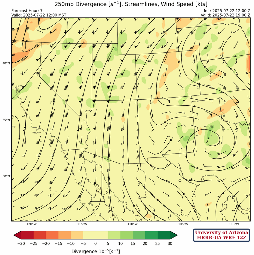 Central and northern New Mexico will be affected by the TUTT centered in Texas with strong divergence aloft and storms moving into the valleys. Localized heavy rain in Albuquerque and Santa Fe is possible (0.5-1″), and also in the eastern third of New Mexico. The precipitation axis is also a little further to the northeast compared to yesterday, away from where the international border is. South into Mexico is void of storms, which is a reflection of the dry air moving into the state from the west.