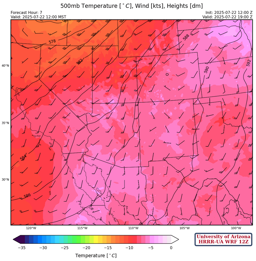 The HRRR-UA WRF 15Z from yesterday was the best forecast of the UA WRF ensemble members as it predicted warming in a layer between 400 and 500mb that would limit deep convection. The tops of the storms blew to the north making most locations in Tucson only receive anvil rain.