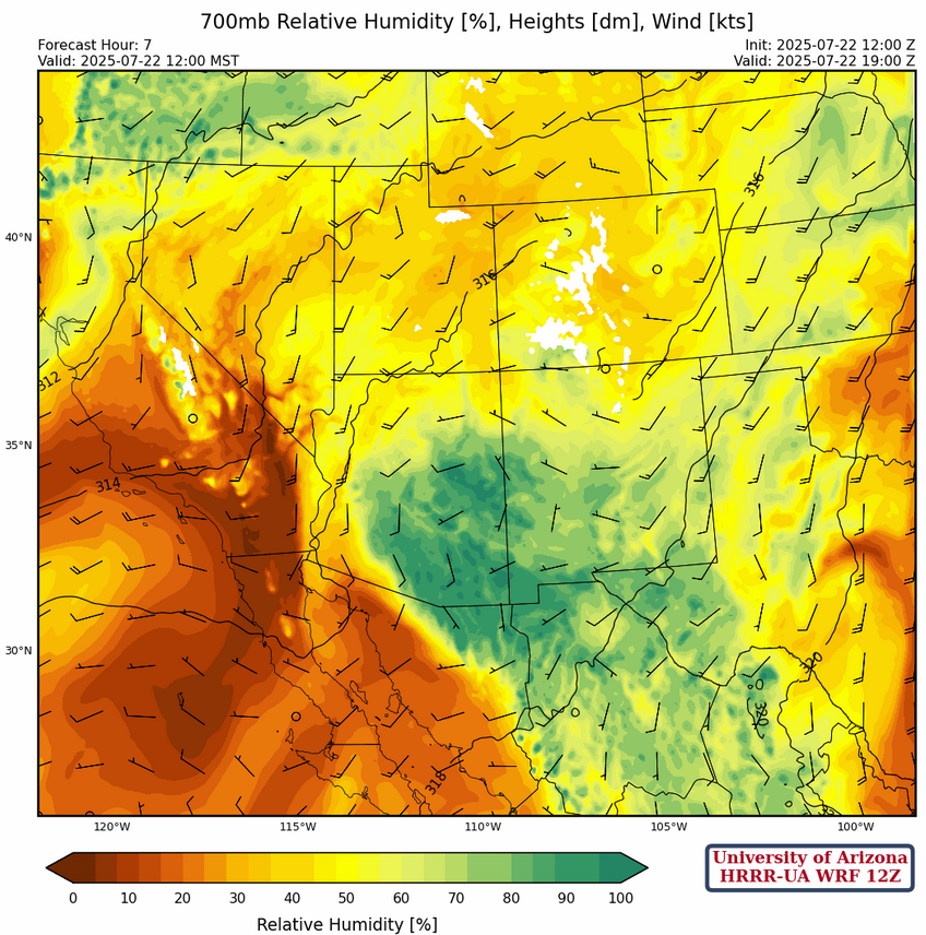 At 700mb we still have a fair amount of moisture today across most of Arizona and New Mexico, the dry air moving in from California will begin to limit convection tomorrow.