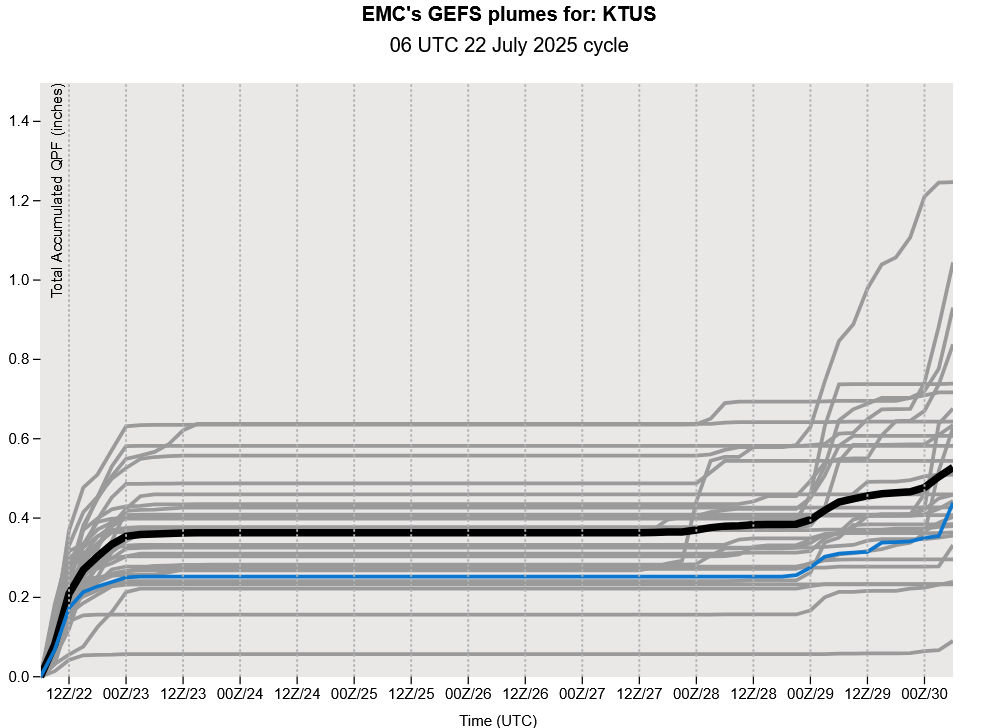 Only New Mexico has precipitation on Thursday as the monsoon circulation has been cut off by the dry air moving in from the west coast. The GEFS plume forecasts show that we are out of the “monsoon business” until next week, with temperatures heading to above normal. The good news is that both the long-range forecasts from GFS and ECMWF show the moisture coming back into the region next week.