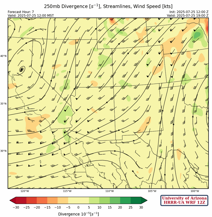 At 250mb the upper-level low has moved onshore near San Francisco this morning with strong westerlies over Arizona becoming southerly in eastern New Mexico along a shear line left behind by the TUTT.