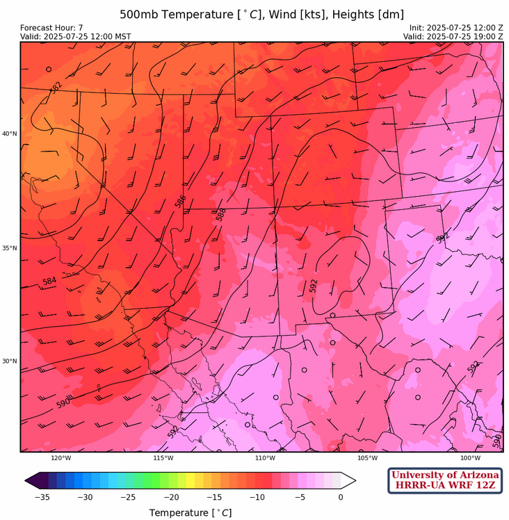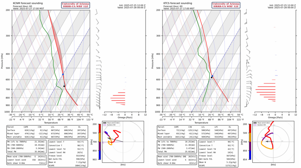 Similar forecast as today with even weaker storms in New Mexico. The radar reflectivity in northwest Arizona is from mid-level clouds producing virga. The storms in New Mexico are probably along the leading edge of the moisture that will be moving in from the Gulf of Mexico.