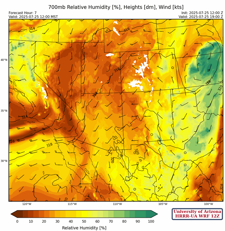 At 700mb, dry air is over the region because of the west coast trough’s circulation. Note the northeast winds along the Texas coast reflecting around the disturbance in the northwest Gulf of Mexico. Although dry for now, moisture will increase in this area and move westward into New Mexico by Sunday.