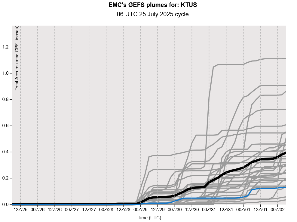 GEFS plume forecasts show the monsoon returning next week. The moisture from the Gulf of Mexico will be in the eastern part of the state Monday but probably only enough for mountain thunderstorms as the low valleys should remain dry.