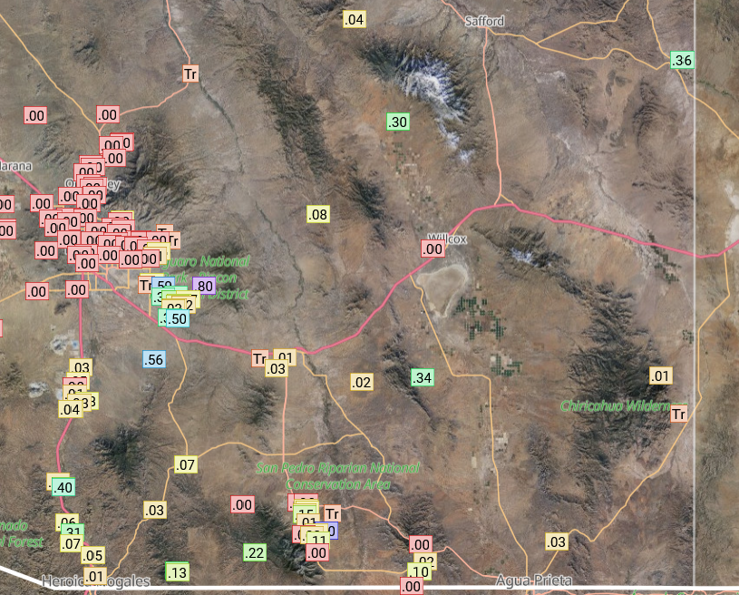 Rainlog.org data below shows the precipitation was more widespread than Tuesday with the westward extent from Nogales to Tucson.