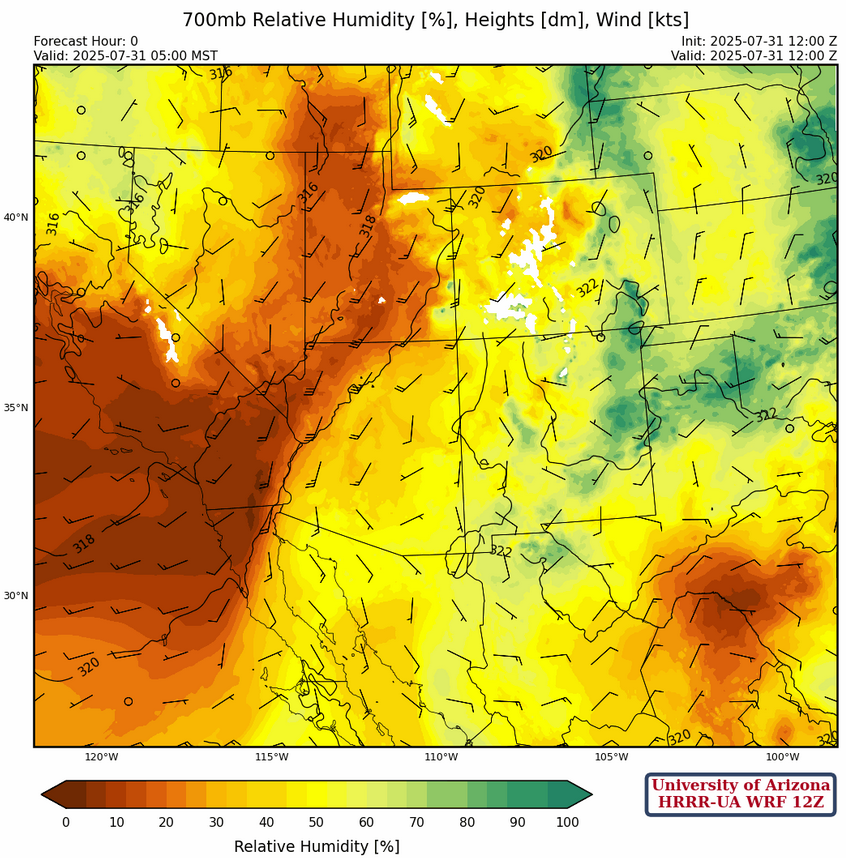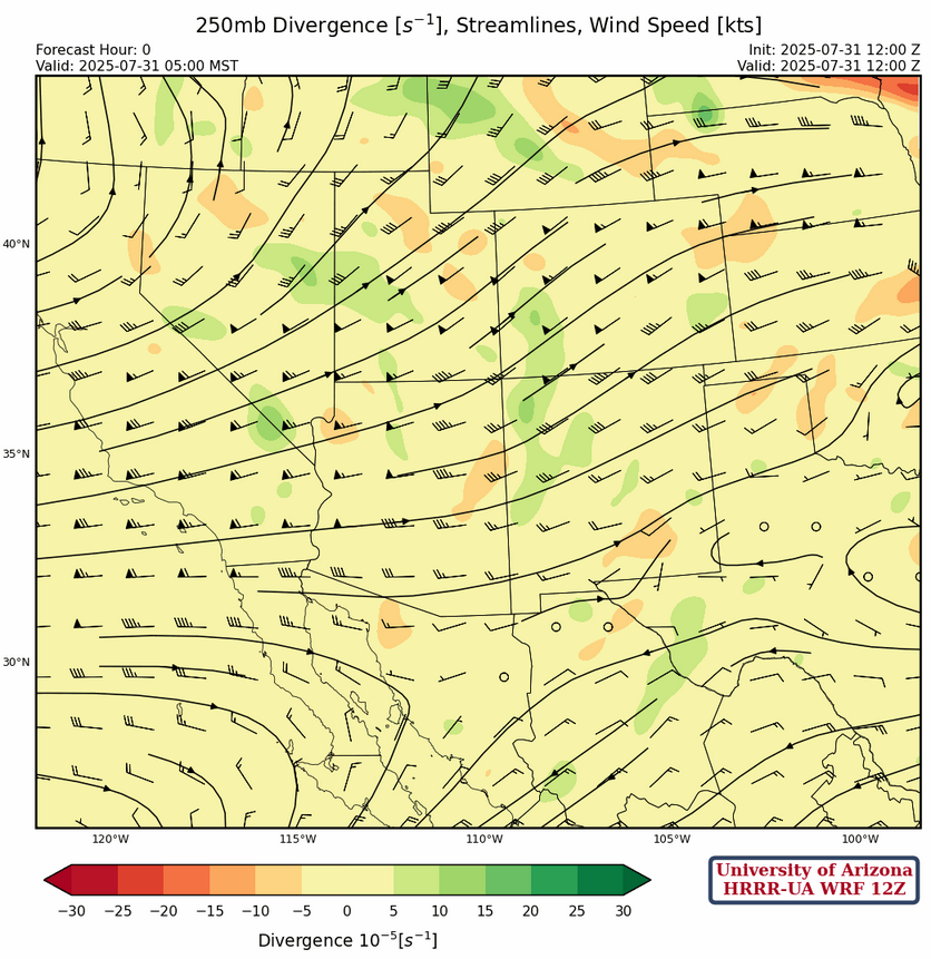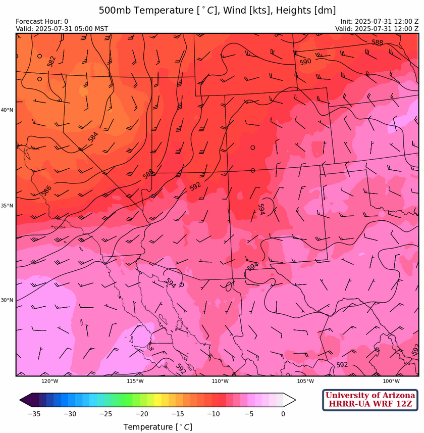 Model forecasts show very little CAPE (~150 [J/kg]) as the ridge is building over the region and flow from the northwest pushes dry air into the region. That said, low-level monsoon moisture is hard to get rid of and isolated thunderstorms are forecast over mainly the mountains of the eastern half of Arizona and most of Mexico.