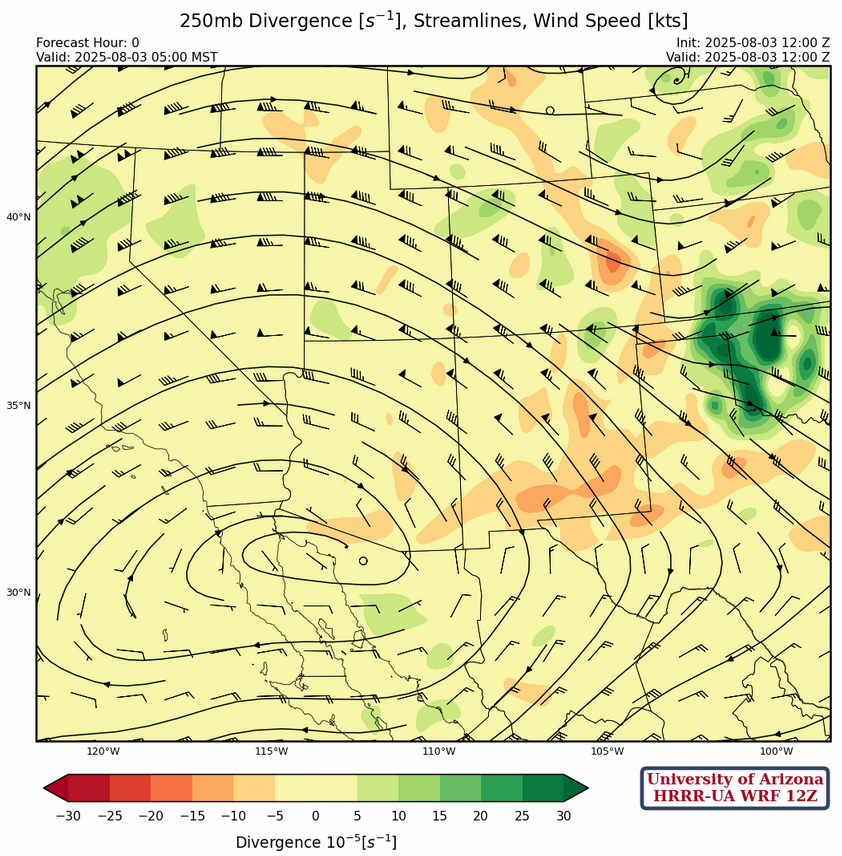 The sub-tropical high pressure ridge at 250mb is located over the northern Gulf of California. The jet stream flows north into northern California, extending to southern Idaho, then southeast to Colorado. Winds are strongest in northern New Mexico with wind speeds of 50 to 75 knots from the northwest decreasing to 35 knots over central Arizona. The winds are weak near the ridge and will shift into southeast Arizona in a couple of days.