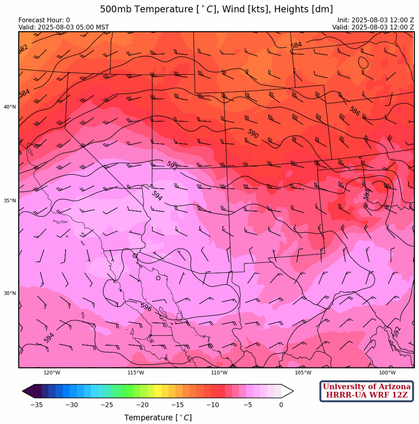 At 500mb, temperatures are very warm across the western half of Arizona and southern California with –3°C at Flagstaff this morning. Such warm temperatures would limit any convection getting up to this level. The ridge axis extends from it’s center over the northern Gulf of California eastward into west Texas. Winds are westerly at 20 to 25 knots across northern Arizona and New Mexico, weakening and becoming northerly to less than 10 knots along the international border.