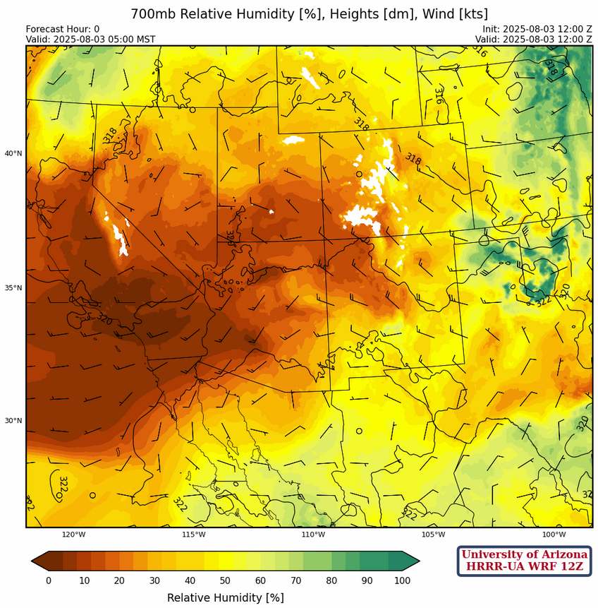 Dry air is present across Arizona at 700mb and will also move into the eastern half of New Mexico today. Phoenix this morning had a dewpoint temperature of –23°C and this will mix through the rest of the boundary layer, lowering surface dewpoint temperatures even more.