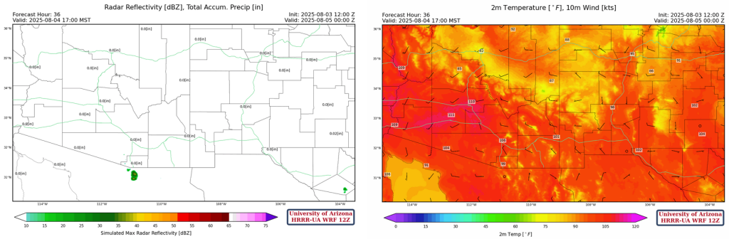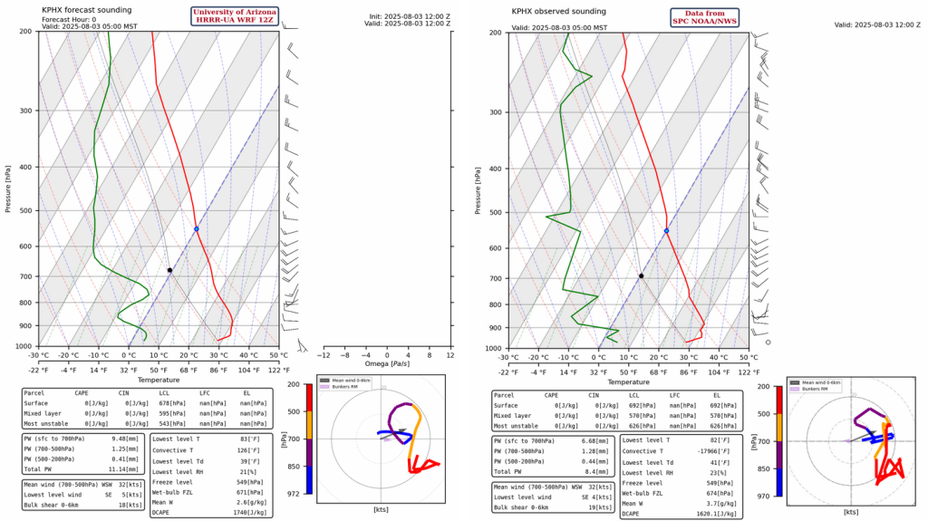 The forecast initialization (left) and observed (right) sounding for Phoenix are shown below. The lack of moisture is apparent from the separation of the red and green lines. The atmosphere probably can’t even make any cumulus and temperatures will be near the record high. Extreme heat warnings are in place for Tucson and Phoenix, and this is forecast to continue for the next four days.