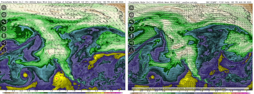 The 12Z GFS model forecast for Friday August, 8th at 11am shows a surge of moisture as a result of a tropical system passing to the south of Baja. The 06Z ECMWF forecast is not quite as aggressive with the precipitable water, but similar. National Hurricane Center has 50% chance of cyclone formation in the next 7 days.