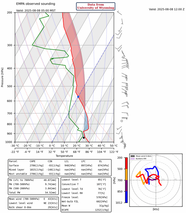 The Empalme (Guaymas), Mexico, sounding shows the gulf surge below 850mb. A moist boundary layer profile, 25kts near surface winds from the south/southeast, and almost 2 inches (54mm) of precipitable water.
